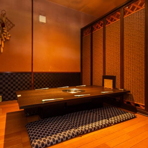 【半個室でゆったり焼肉を楽しむ】個室や半個室席は、プライベートな空間でゆっくりと食事を楽しみたい方にぴったり◎4名様用の半個室と、6名様用の個室をそれぞれご用意しております。デートや接待、家族での食事など様々なシーンに合わせてご利用ください!柔らかな照明と和の設えが、特別な時間を演出します♪